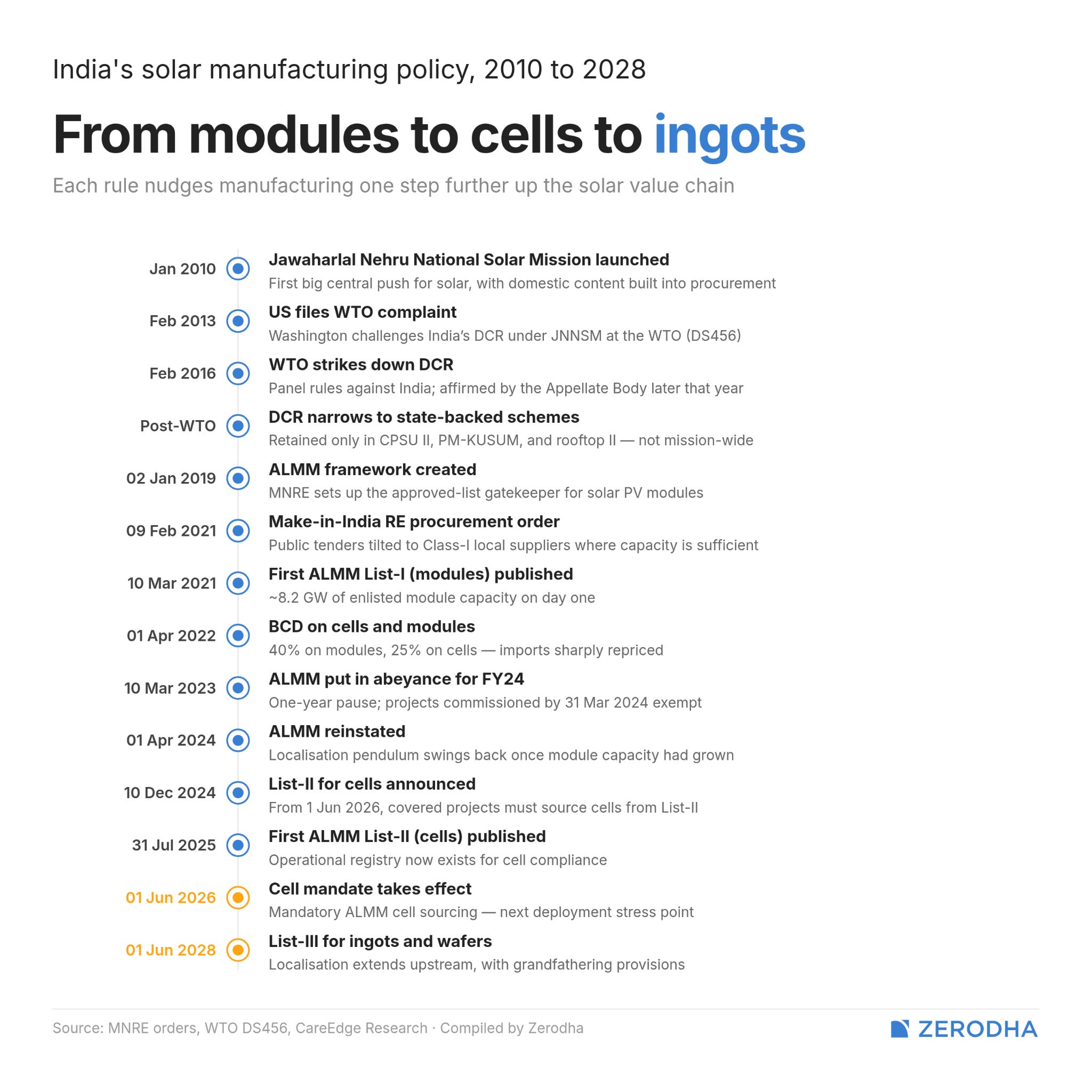 The further upstream you go, from cells to ingots, the story gets thinner. India’s first commercial ingot-wafer facility — a 2 GW plant — only came online in FY25. The government has already announced ALMM List-III for ingots and wafers. But it’s quite likely that the same supply-demand tension the country is navigating right now for cells will almost certainly replay two years from now for one step further up the chain.