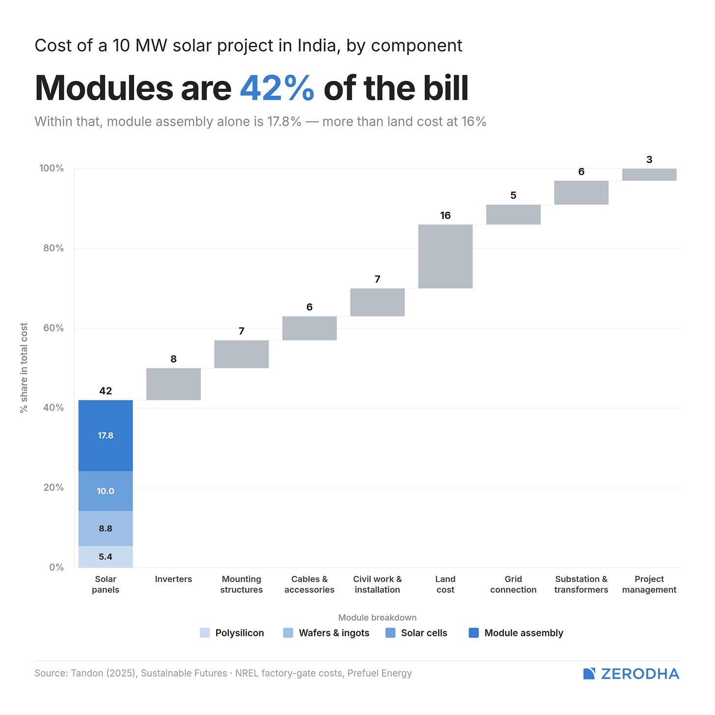 And, as we’ve covered before, China’s grip on the upstream remains overwhelming. Three-quarters of India’s solar imports by value still come from China. Even as late as 2024, CRISIL estimated that cell imports as a share of India’s total consumption were still running around 80%, nearly all from China.