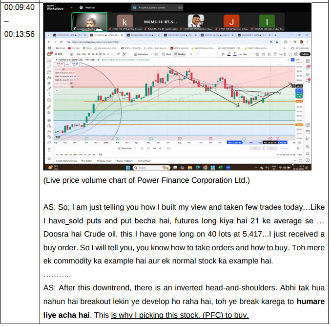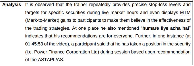 To start with, SEBI seized video recordings of the courses in the raid. Across every course, Sathe (or one of the other teachers) explained an entire trade: from the stock choice, to when and what price to buy, all in real time. A huge no-no in the eyes of SEBI, which does not allow live-trading sessions in educational courses.
