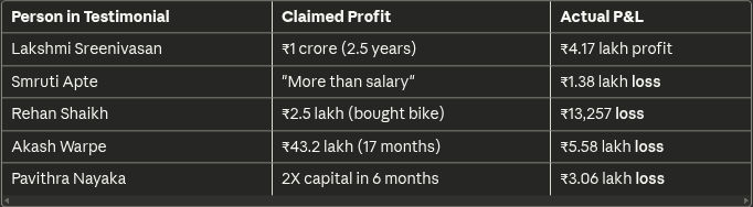 If you zoom out from these testimonials, it becomes clear that Avadhut Sathe has no magic formula for beating the market. For 186 ex-students, SEBI found that in the 6 months after the course completion, 65% of them incurred losses. In total, this entire set of 186 people made a dismal loss of ~₹1.9 crore.