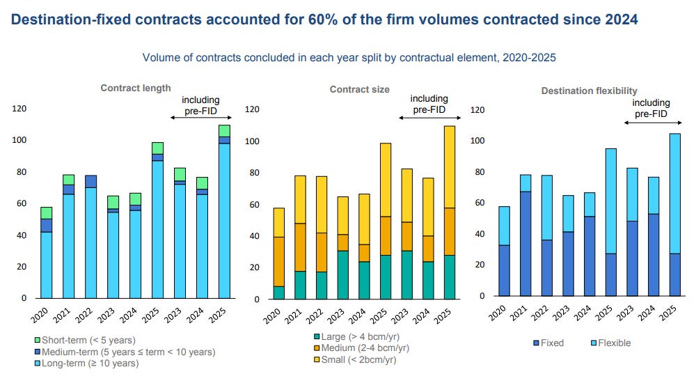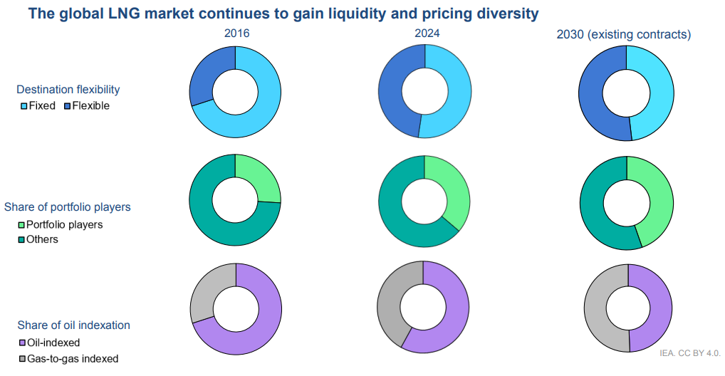 Traditionally, most LNG was traded under rigid, long-term contracts with fixed destinations and oil-indexed prices. However, now, buyers are opting for contracts with flexible prices, and more interestingly, with flexible destinations. That is, they can choose to sell the gas they’ve bought anywhere, not just one region. Between 2016 and 2024, the share of destination-free LNG contracts jumped from just 29% to 45%.