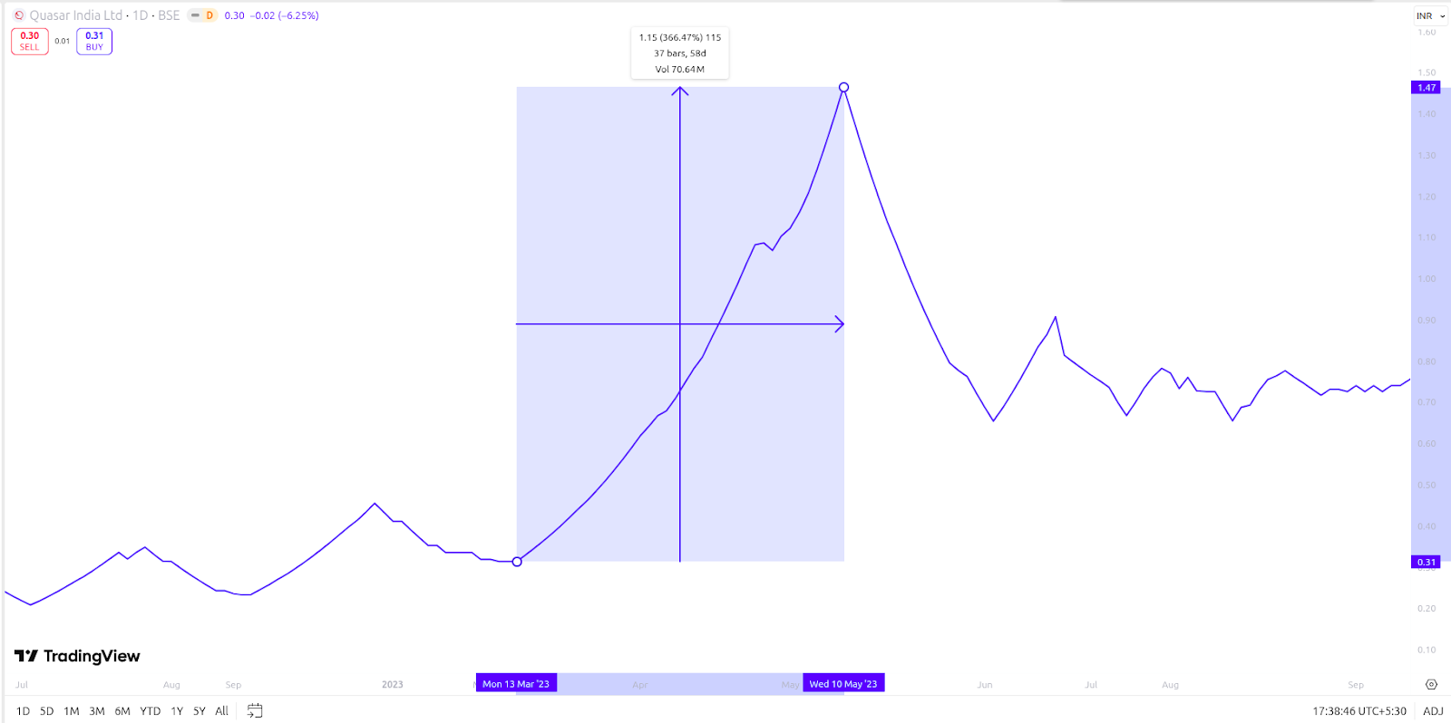There’s a little-known trading company based in Ahmedabad, called Quasar India Limited. It’s a standard business, really — it trades and distributes commodities, particularly agricultural commodities. Nothing exciting. But it was at the heart of something odd: a couple of years ago, its shares suddenly went up ~400% in the space of two months.