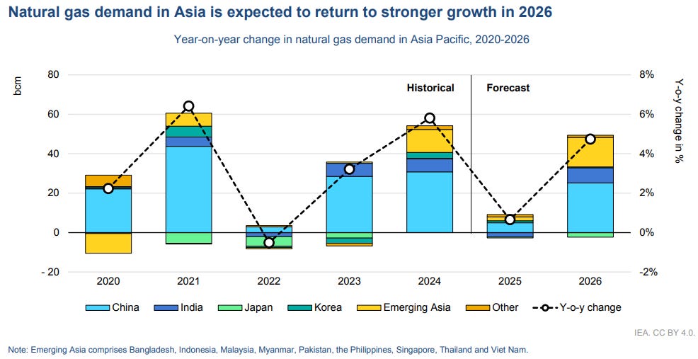 On the other hand, there is Asia, whose story is a little more concerning. Demand grew less than 1% this year — its weakest growth since 2022. High LNG prices in the first half, along with macroeconomic headwinds kept consumption in check, preventing countries like India, Pakistan, and Bangladesh from importing huge volumes. In fact, we’ve covered before why India finds it so hard to import gas.