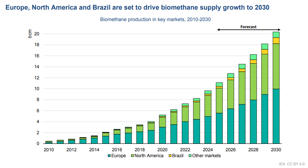 Biomethane — renewable natural gas made from biomass — is the leading alternative. Global biomethane production nearly tripled between 2018-2024, and is further expected to contribute over 50% of the increase in all low-emission gas supply. Europe is currently the largest biomethane market, producing ~5 bcm last year and expected to reach ~10 bcm by 2030. In fact, Denmark already meets ~45% of its gas demand from biomethane. The US and Brazil, the IEA notes, also have huge biomethane potential.