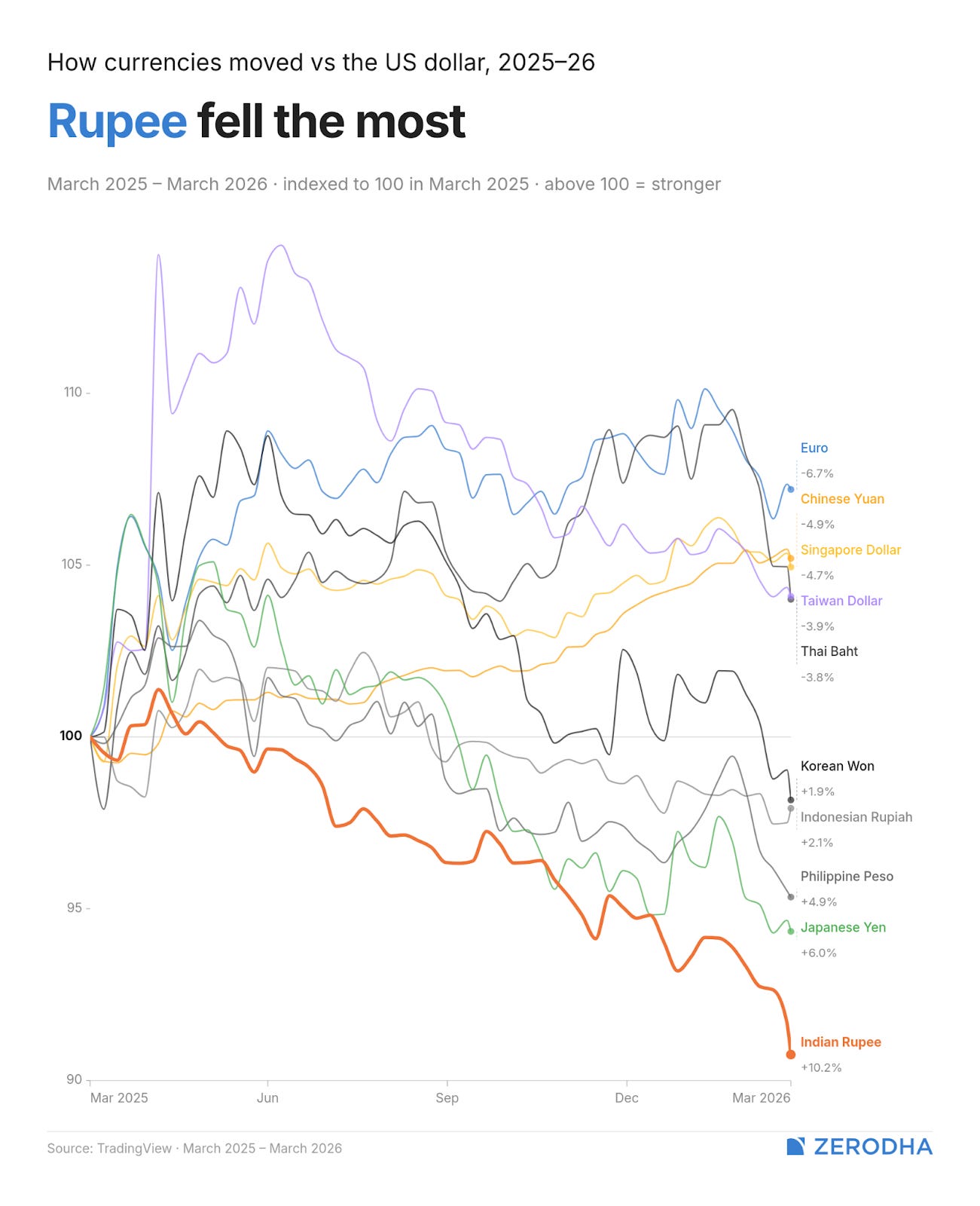 The rupee weakened by 10%, making it the worst-performing major currency in Asia by some distance. And critically, most of that weakness arrived before the war. The conflict began in late February — by that point, the rupee had already slipped from ₹85.5 to ₹91. The war then accelerated what was already happening, pushing the rupee past ₹93 in under four weeks. That’s the near-vertical line on the chart, indicating the nosedive it took when it met a major external shock.