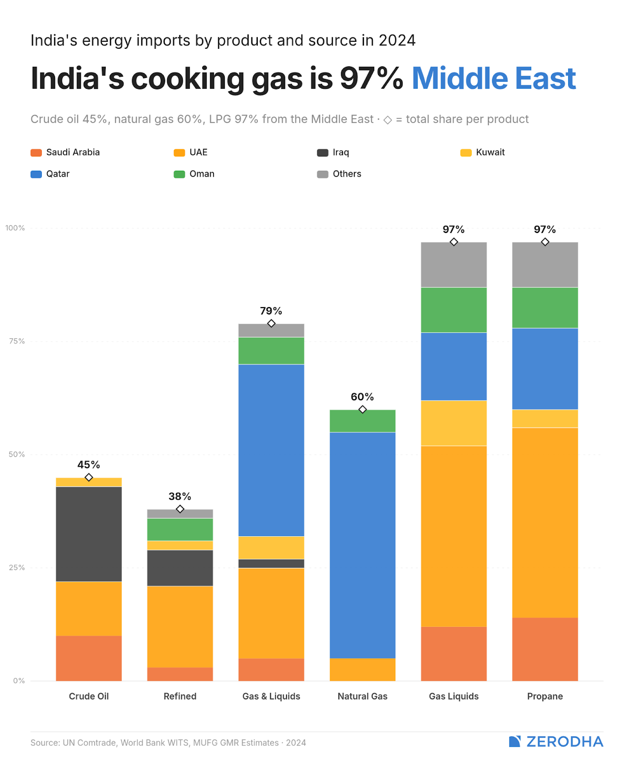 Most of India’s LPG comes from the Middle East. Now, crude oil can still be rerouted: India has been buying Russian crude in bulk at a discount since 2022. But LPG can’t switch paths as easily. It requires specialised refrigerated tankers, the global spot market for it is thin, and India’s import infrastructure is deeply tied to Gulf sources.
