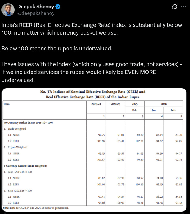 The REER fell from 102.3 in February 2025 to 94.1 in February 2026. Indian goods and assets are currently on sale for the rest of the world. Deepak Shenoy of Capitalmind has pointed out that even this reading likely understates the undervaluation, since the index only accounts for goods trade and not services — and India’s services exports are enormous.