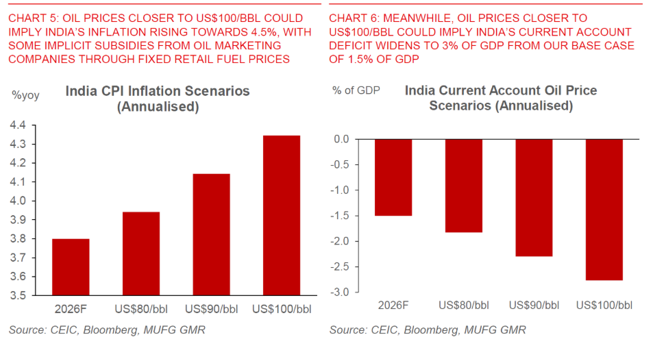 MUFG estimates that every $10 rise in oil prices widens India’s current account deficit by about 0.4 to 0.5 percentage points of GDP. India’s current account deficit was already 1.3% of GDP in the third quarter of this financial year. If oil holds around $100 a barrel, MUFG estimates the deficit could widen to nearly 3% of GDP. That means India structurally needs more dollars than it earns, and the exchange rate must keep adjusting to reflect that.