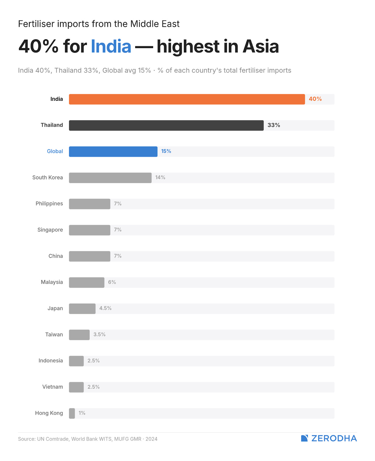 See, beyond urea, the Gulf nations also account for about 40% of India’s finished fertiliser imports — far more than most other Asian economies. That, in turn, impacts on food production costs significantly. MUFG flags this as a delayed risk: the shock arrives in March, but its effect on food prices will only become visible when the kharif sowing season begins in June and farmers are buying fertilizer they may not be able to afford.