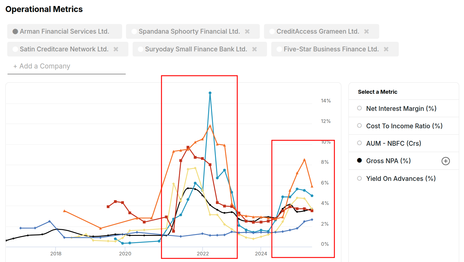 To answer that, we usually look at one thing — NPAs. Loan defaults are the clearest signal of stress, and can wipe out years’ worth of profits in an instant. But the stress doesn’t show up immediately. There’s a lag between when a loan is disbursed and when you realise it was a bad idea. The length of that lag depends on the type of lending. For home loans, that can be 7-10 years (or more). For microfinance, thankfully, it’s usually just 12–18 months. It is why loans given out in 2020, which blew up during COVID, only showed up in the numbers in 2022. That period, thankfully, is short enough for quick amends.