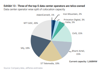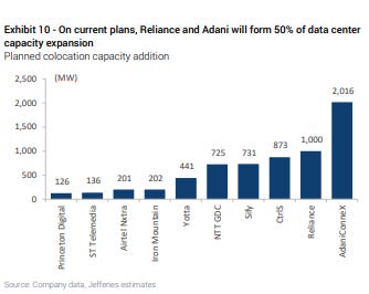 In fact, Jefferies thinks the capacities of groups like Adani and Reliance could super-charge the data centre boom. If current plans take shape, it says, then Reliance and Adani could prop up half of India’s data center expansion in the near future.