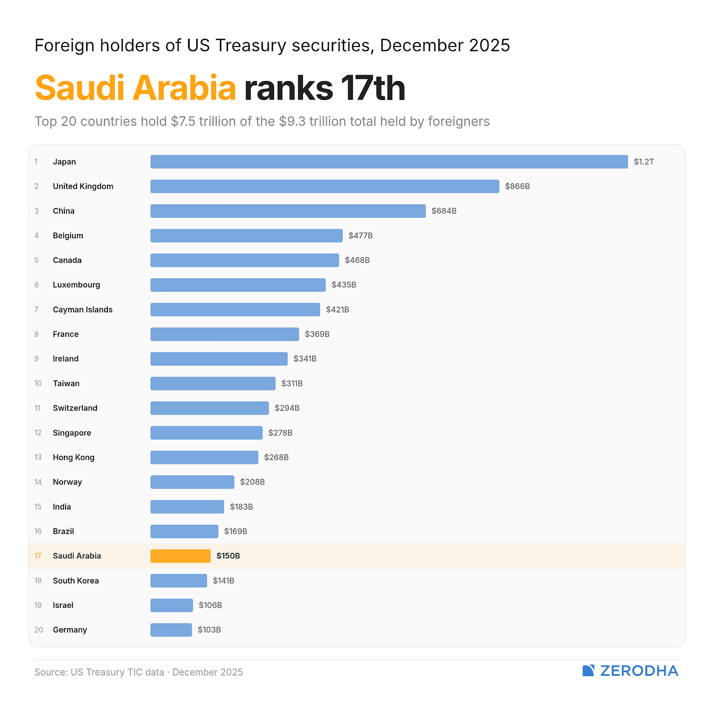 Lately, dollar surpluses haven’t been going to US treasuries like they used to. Gulf states no longer park most of their oil windfalls in US safe assets like treasuries and bonds — Saudi Arabia is the biggest of them, yet ranks 17th in the whole world.