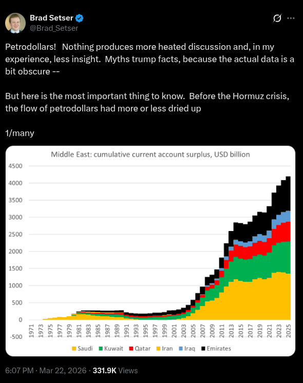 We saw a provocative thesis from Brad Setser, a former US Treasury economist. He said that the flow of petrodollars has “more or less dried up”. And this was even before the Strait of Hormuz crisis stranded much of the world’s energy supply.