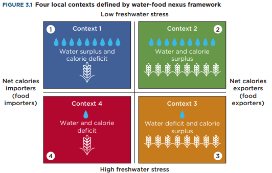 Here’s how the World Bank thinks about this. You can divide the world’s countries along two axes: how much water stress it faces, and whether it imports or exports food. This creates four quadrants: each showcasing a different relationship between water and food.