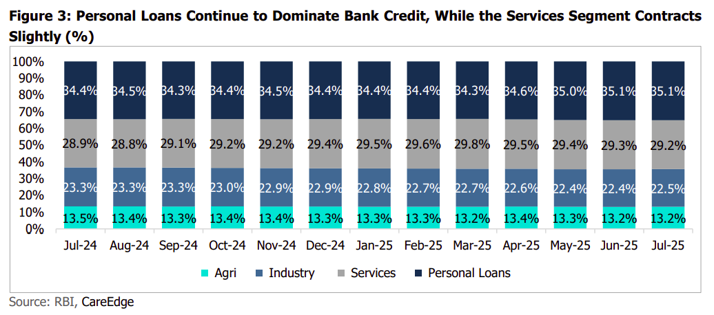 Here’s the picture: growth in agriculture and industry has been very weak. Together, they make up about 35% of total credit, and their slowdown is a big reason the overall number looks dull. On the other hand, services and personal loans—roughly 65% of the mix—have been a silver lining, growing at double digits.