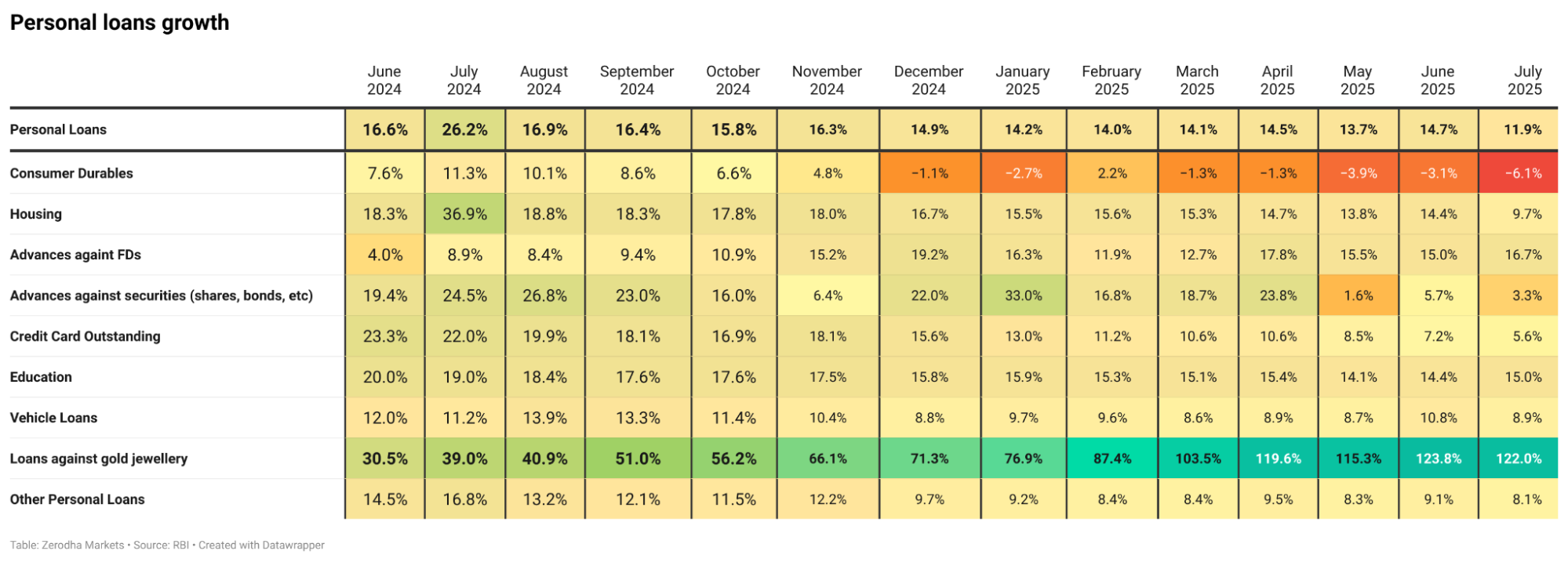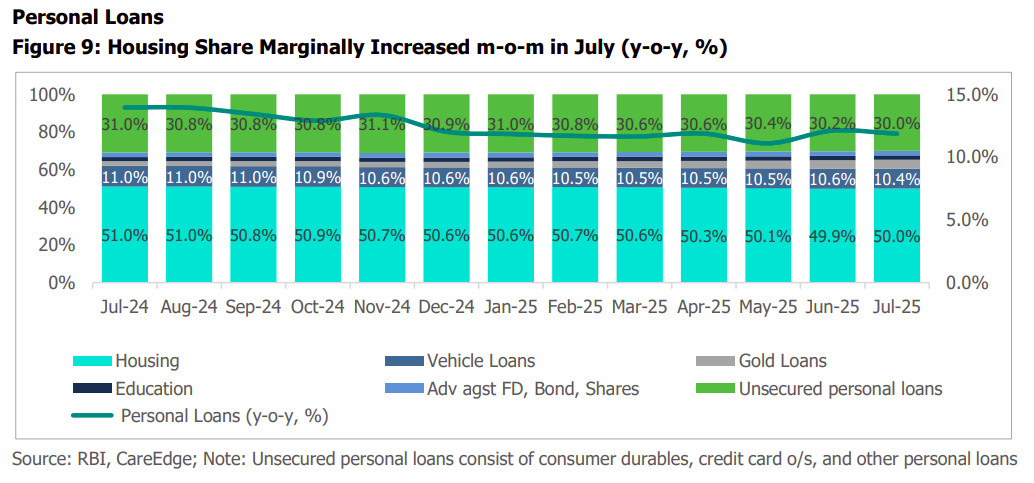 This category covers all the loans banks extend to people like us, mostly for consumption. Within personal loans, housing loans dominate, accounting for nearly half the mix. Which means, if housing slows, then the entire pie shrinks significantly. And while growth hasn’t fallen off a cliff yet, it has clearly lost steam, growing just 9.7% in July 2025.