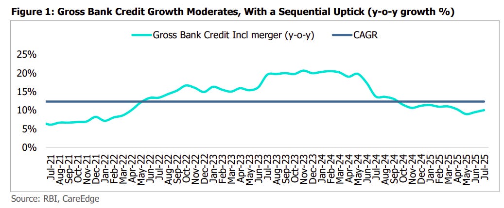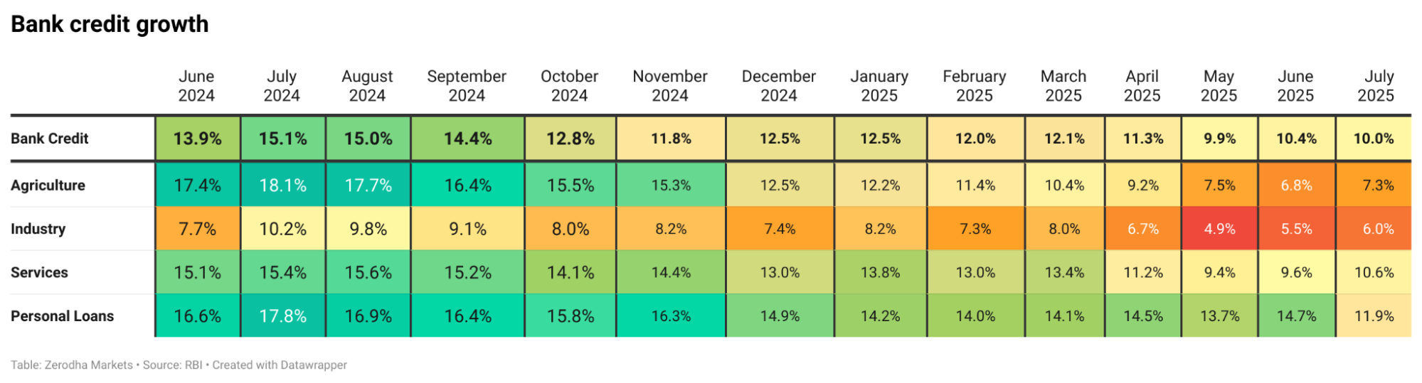 Credit in India right now is a mixed bag. Personal loans are cooling, services are inching up, and MSMEs are quietly gaining ground while big corporates sit out. Overall growth seems to be bottoming out around 10%, but it’s too early to call a full rebound.