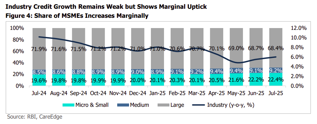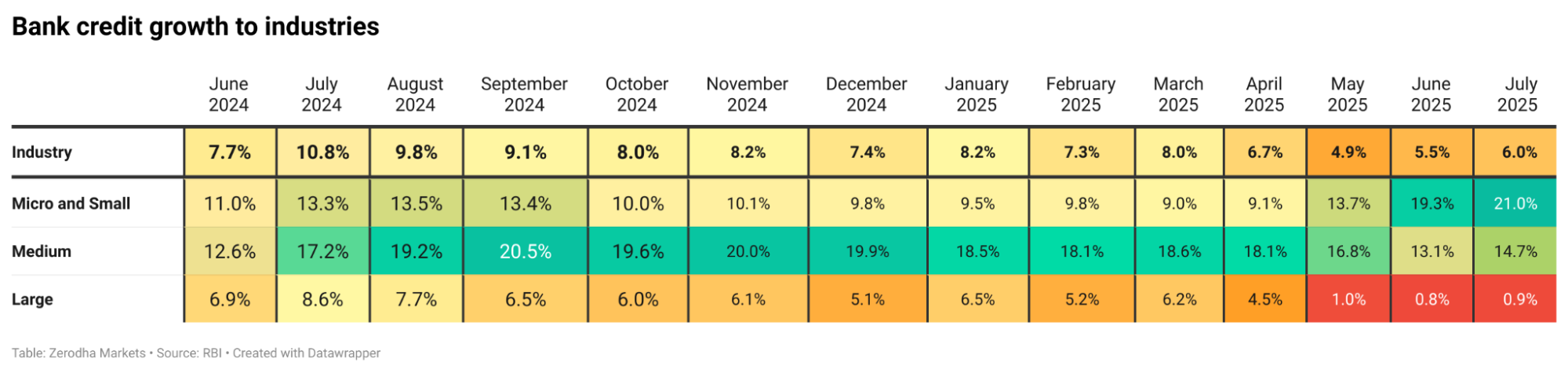 The real action has been in MSMEs — something we’ve mentioned before on The Daily Brief. Their credit growth has consistently outpaced that of large industry, and as a result, their share of industrial credit has climbed—from 71.9% large corporates in July 2024 to 68.4% a year later. That may sound small, but it reflects a genuine shift. Policy support measures like ECLGS and CGTMSE, plus the broader formalisation of small businesses, have helped.
