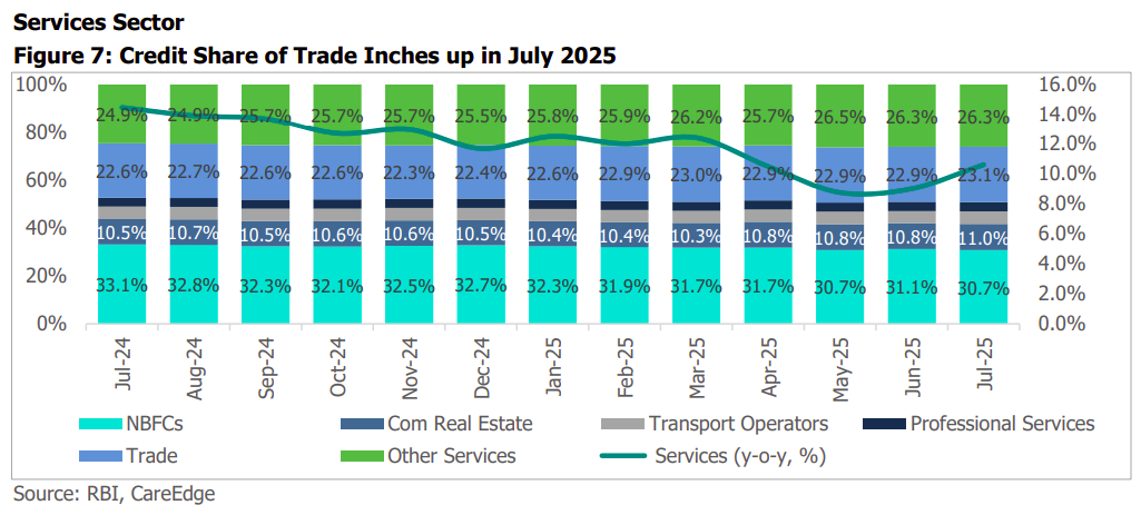 Credit growth in the services sector is showing faint but steady signs of life. A big chunk of this lending goes to NBFCs, which take up about 30% of services credit, while trade—think distributors and kirana stores—accounts for another 11%.