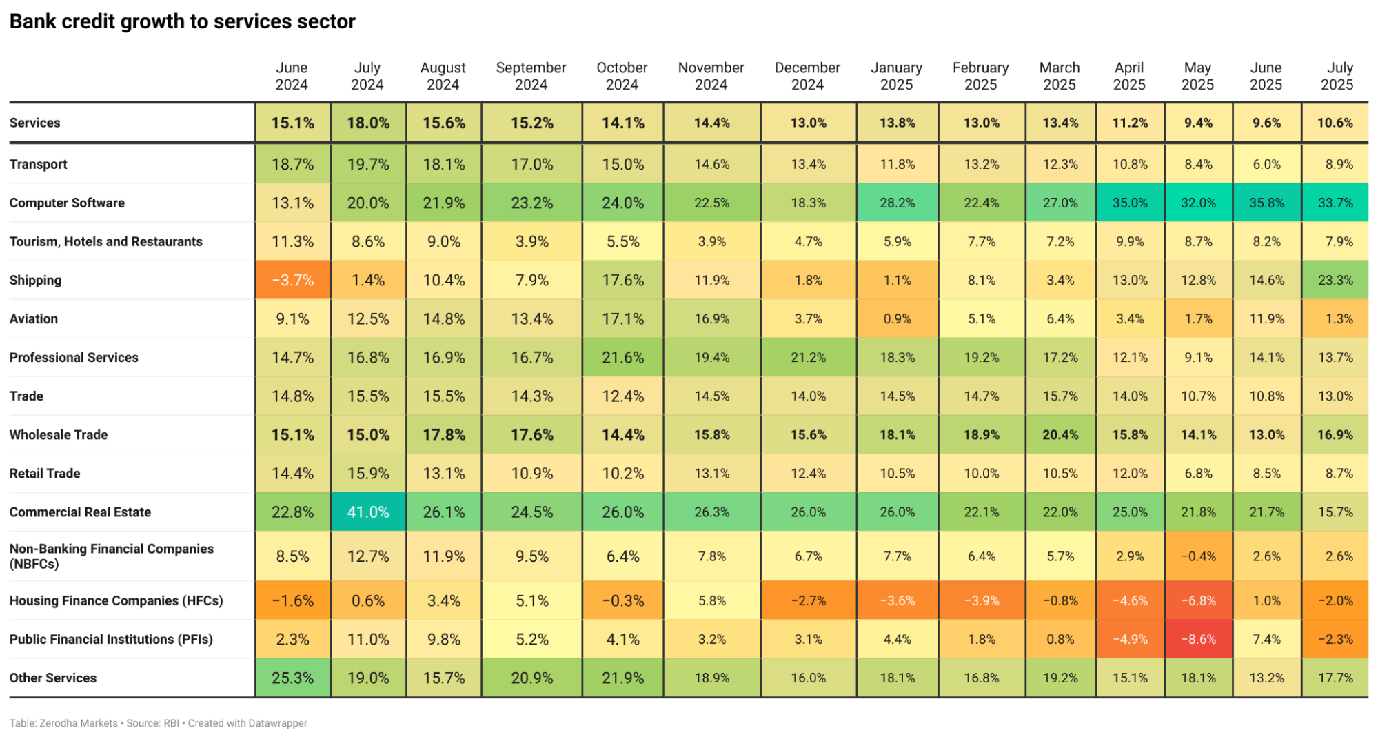 Beyond NBFCs, other patterns stand out. Credit to commercial real estate—money for building offices and projects—has been slowing consistently. On the brighter side, tourism, hospitality, shipping, and computer services have all been attracting fresh lending. Aviation, though, remains stuck in a lull.