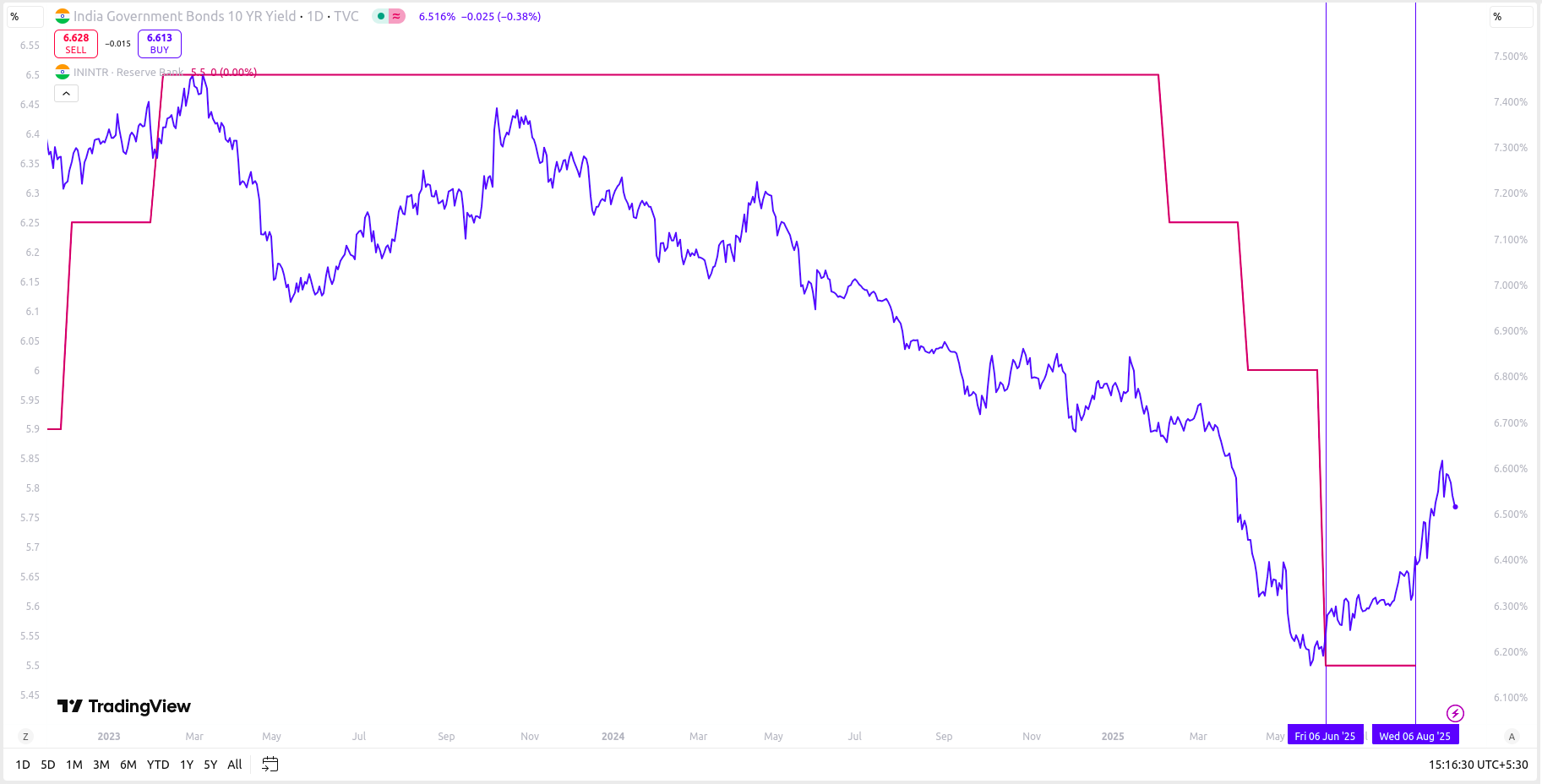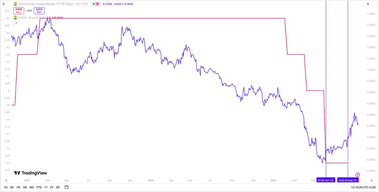 But — surprise — the opposite has happened. After the RBI’s huge 50-basis-point cut on June 6, bond yields spiked instead of falling. From a low of ~6.16%, they climbed to ~6.53% at the time of writing.