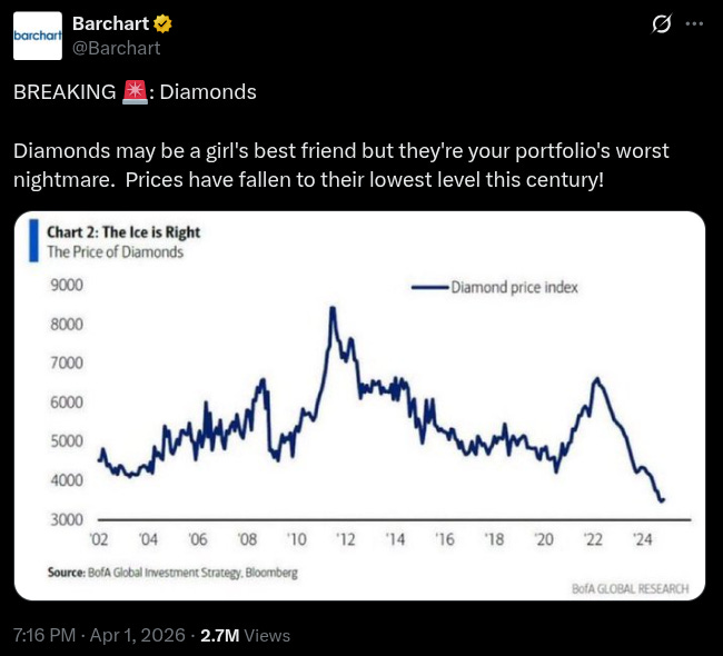 The American market shifted dramatically toward them, with more than half of all US engagement rings now carrying a lab-grown stone. China — the other great engine of global diamond demand — essentially exited the market, with Chinese diamond consumption falling from around 100 billion yuan in 2021 to just 43 billion yuan by 2024 as consumers moved toward gold instead. For a company whose entire model rested on manufactured scarcity, this was an existential problem, and the Barchart chart captures exactly what happened to prices as a result.