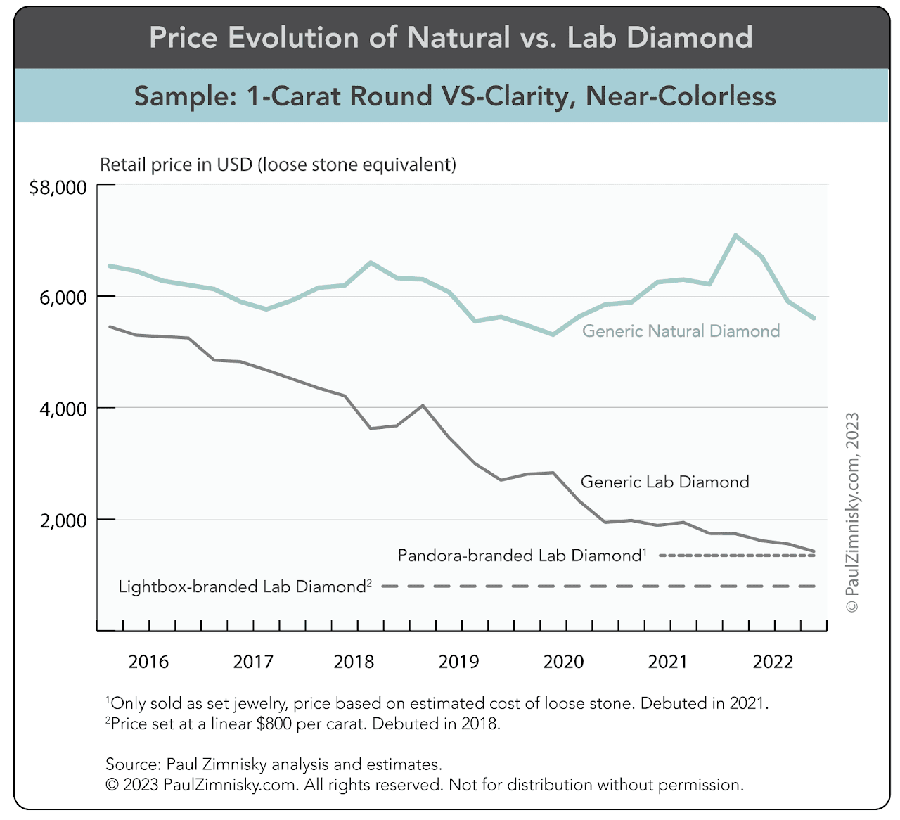 Then came lab-grown diamonds, and everything started unravelling. Scientists figured out how to grow diamonds in a laboratory — stones that are physically, chemically, and optically identical to mined ones, which a professional jeweller cannot tell apart without specialist equipment. Because they can be mass-produced, their prices collapsed. According to data tracked by diamond analyst Paul Zimnisky, a one-carat lab-grown diamond that cost around $5,000 in 2016 now costs under $1,000.