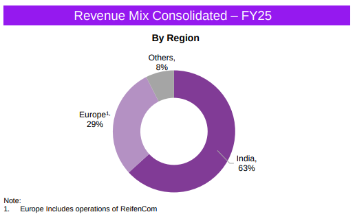 Mind you, Apollo isn't just exporting to Europe; they have a genuinely international manufacturing presence. Beyond its five plants in India, the company runs two plants in Europe — in the Netherlands and Hungary. 63% of its revenue comes from India, while 29% comes in from Europe.