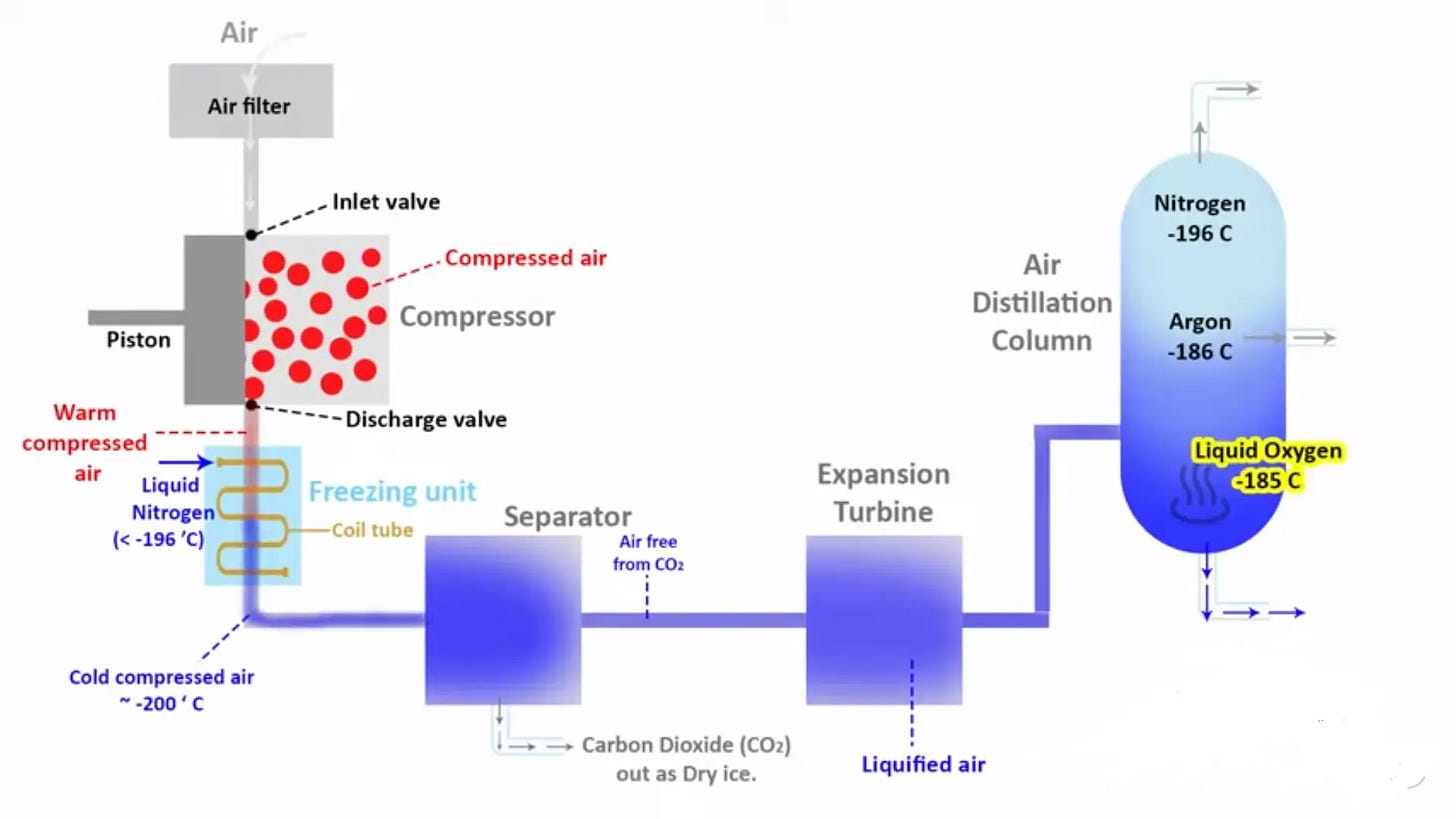 But this composition of air is useless to any industrial process. A blast steel furnace, for instance, needs 99.5% pure oxygen, delivered at high pressure, 24x7. A semiconductor fab doesn’t want mere “normal” nitrogen — its supply should be free of every trace of moisture and dust. Even a cola bottler doesn’t want “random” carbon dioxide; it wants sterilized, beverage-grade CO₂.