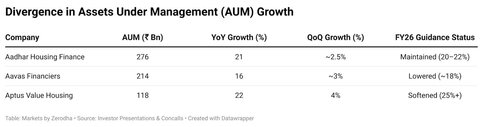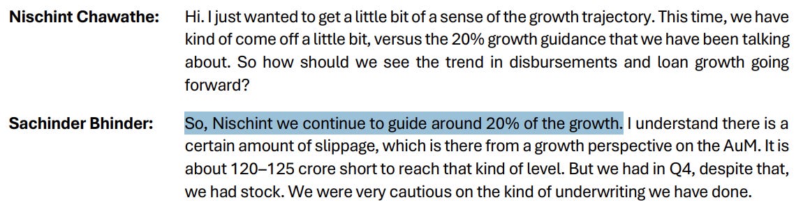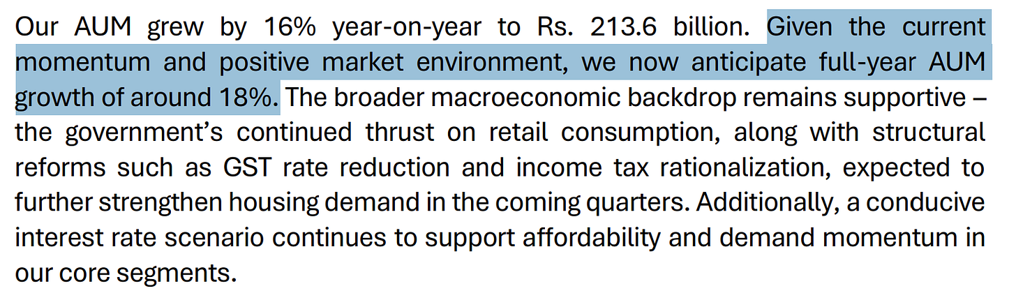 Aavas Financiers had initially guided for 20% growth in assets under management. But they toned that down mid-year — first to a 18-20% range, and then to 18% in the latest quarter.