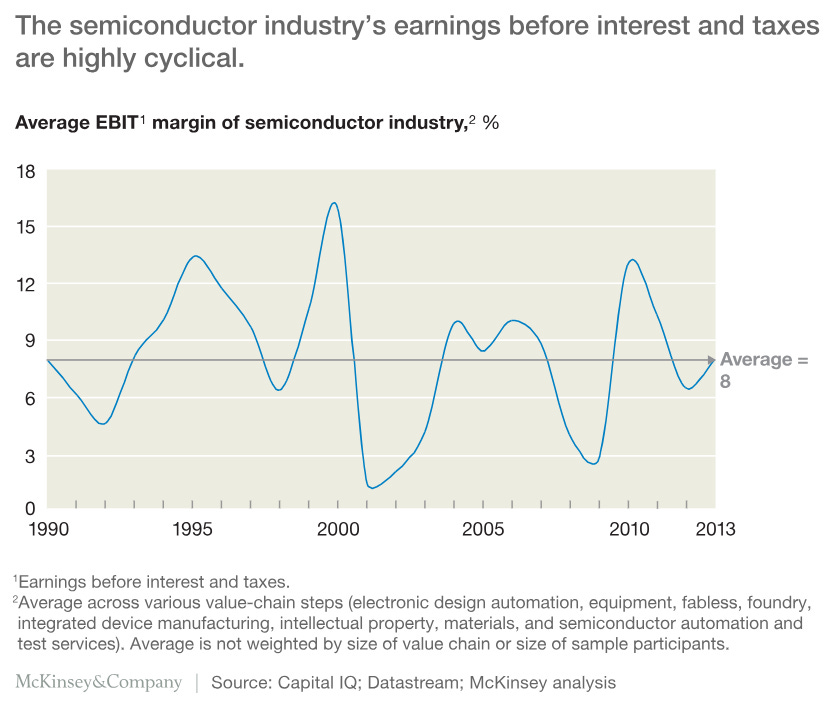 This swing between over-demand and over-supply also reflects in the industry’s margins, which are either too high or too low, but never stable. And since fabs are so expensive to keep idle, companies keep running them even when prices crash, flooding the market with supply, tanking prices further.
