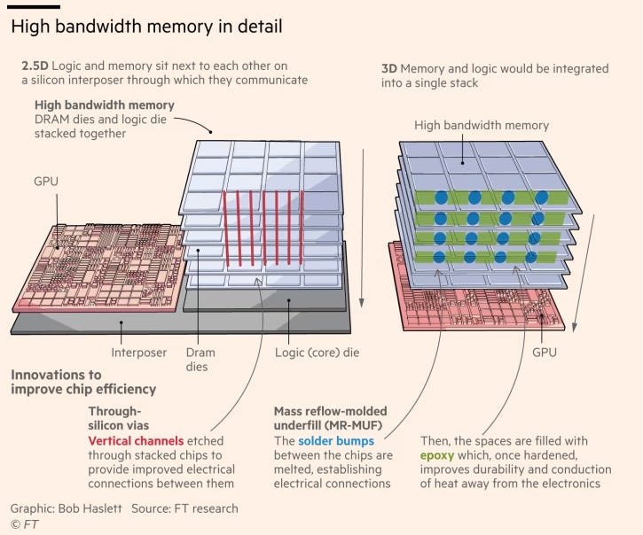 Unlike the commoditised DRAM, which is made on a two-dimensional plane, the three-dimensional HBM is far more complex to manufacture. It requires extremely fine structures called through-silicon vias, which enable the 3D structure. Packaging HBMs is also incredibly hard, and known to be one of the biggest bottlenecks in the industry.