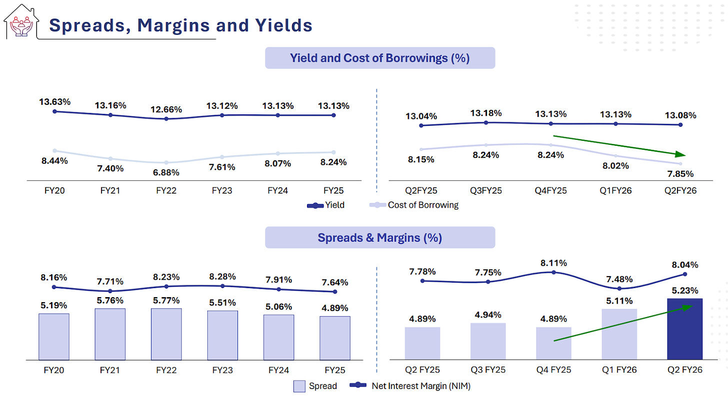 Aadhar’s management noted a drop of ~40 basis points (bps) in their incremental borrowing cost by the end of the quarter, and projected perhaps another 10 bps improvement by year-end. Importantly, Aadhar did not lower its prime lending rate during this period, which helped expand margins. However, they have indicated that they might lower it in the near future.