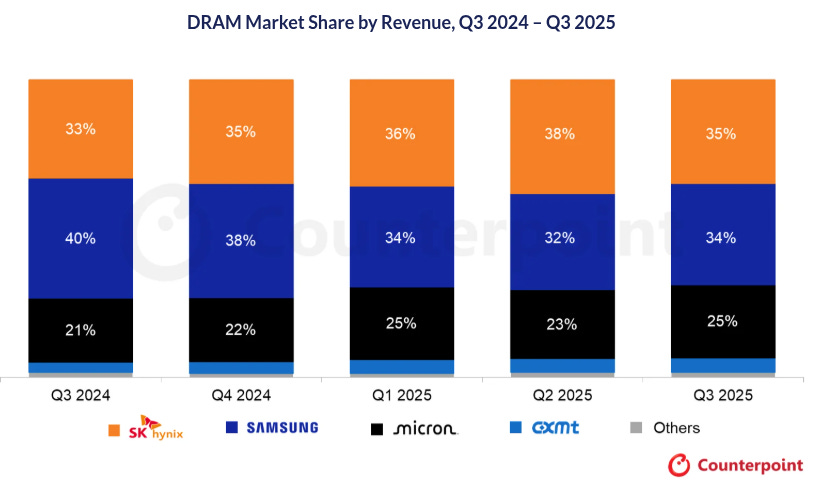 SK Hynix was the first mover and market leader, having pioneered HBM development back in 2013, primarily to escape traditional DRAM’s 2D limits. By 2023, SK Hynix’s HBM3 generation of chips were in most of NVIDIA’s AI GPUs. The company’s revenue doubled in 2024 to a record $46 billion, with HBM making up 40% of its DRAM sales today. And recently, for the first time ever, Hynix surpassed Samsung on DRAM revenues.