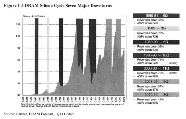The third feature is that memory is a wildly cyclical industry. During boom periods, there’s tons of demand for memory chips, and memory makers throw money to build capacity. However, even before those expansions are done, demand often collapses. Companies go bust, causing a situation of oversupply.