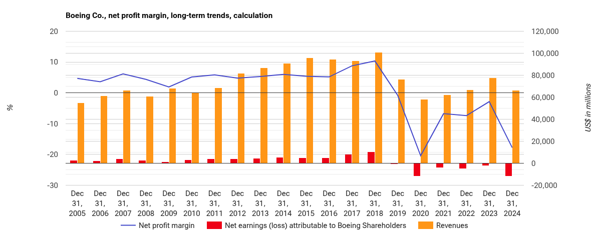 The struggles don’t end here, though. When starting to make planes, manufacturers typically lose money on every unit, making profits extremely elusive. Between 1970 and 2010, Boeing barely averaged a 5% net profit. In recent years, it’s consistently been recording losses.