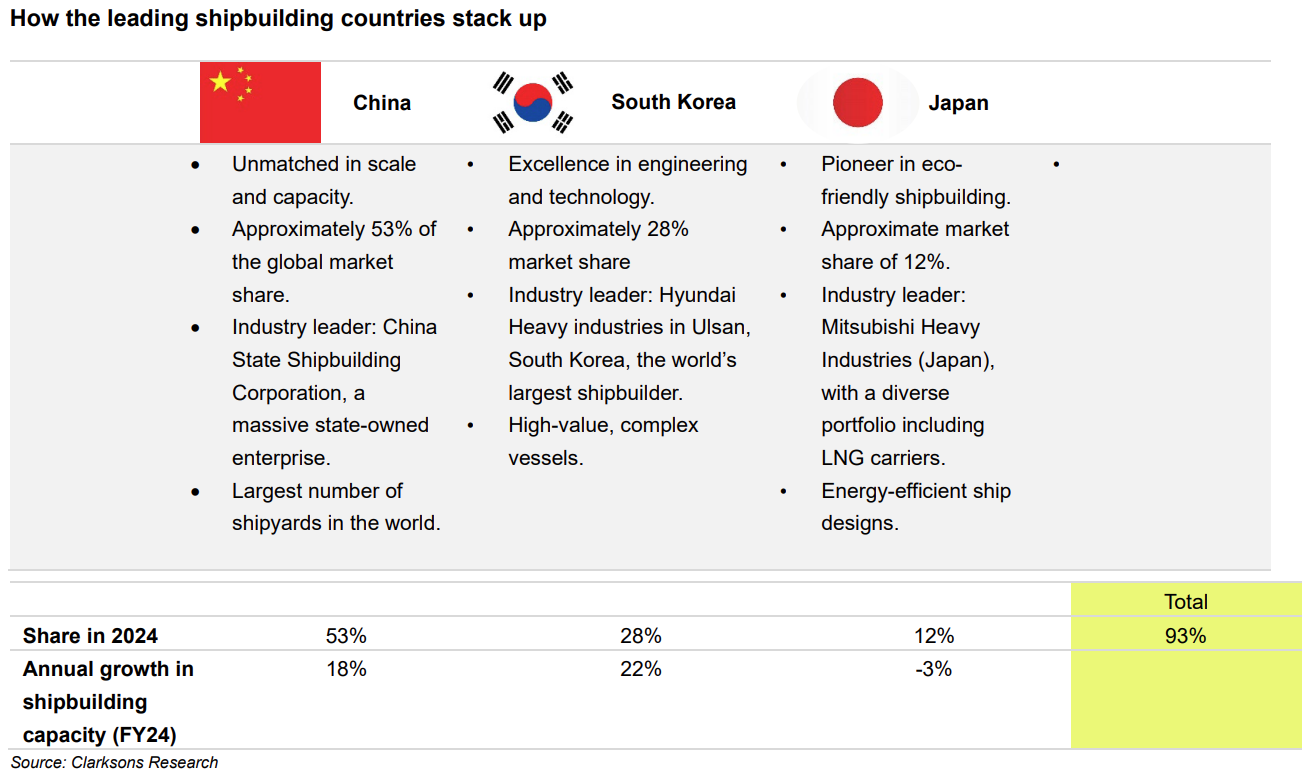 Then comes the neighbourhood reality. China’s navy is assessed by U.S. DoD as the largest in the world by number of battle force ships, with “over 370” platforms and projected growth ahead. Meanwhile, global commercial shipbuilding is heavily concentrated: in 2024, China, South Korea, and Japan produced about 95% of global shipbuilding output, and China delivered over half of the world’s capacity for the first time.