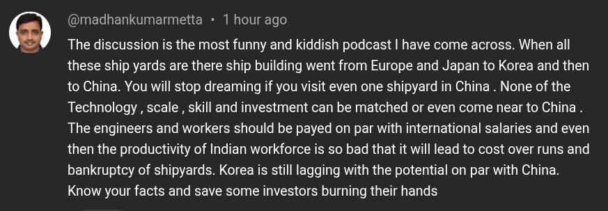 What I came away with is (hopefully) more grounded: shipbuilding is a bet on whether India can build a real maritime industrial base—yards, suppliers, skills, and financing—so we aren’t permanently outsourcing the pipes of our own trade. That’s a big if. Shipbuilding is brutally technical, and China didn’t stumble into dominance. It built it, patiently, over time. One comment on our video put it bluntly: “You will stop dreaming [building ships in India] if you visit even one shipyard in China.”