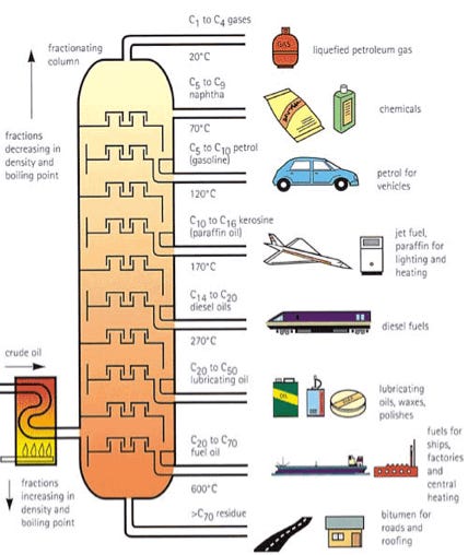 Refineries heat crude oil in a furnace until it mostly vaporizes. Then, they push that vapour into a tall steel tower (called a distillation column) that is hot at the bottom and progressively cooler at the top — much like how hilly areas work. As the vapor rises and cools, different molecules condense back into liquid at different heights, depending on their boiling points. Each layer that collects from top to bottom is called a “fraction“, and each of it becomes a different product.