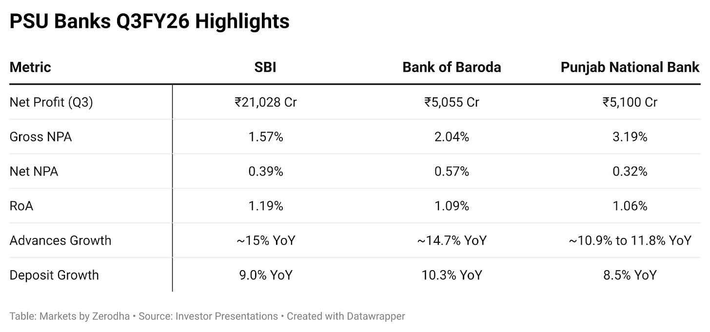 SBI posted its highest-ever quarterly net profit — at ₹21,028 crore, up 24.5% year-on-year. PNB and BoB came in at a more modest ~₹5,100 crore each, growing ~13% and ~4.5% YoY respectively.