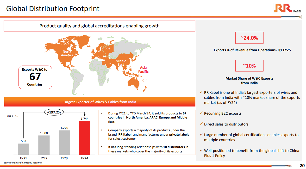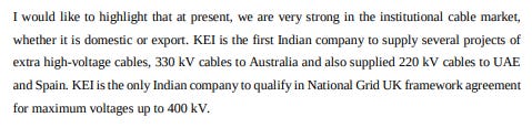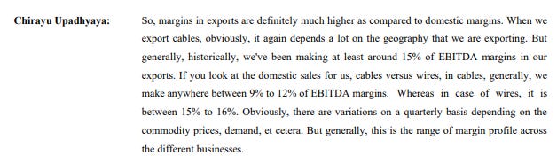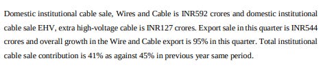For RR Kabel, exports make up more than a quarter of their revenue — a far bigger share than KEI or Polycab. By their own admission, they’re one of India’s biggest exporters of wires & cables. While not disclosing any figures this quarter, they have indeed attributed part of their success this quarter to exports.