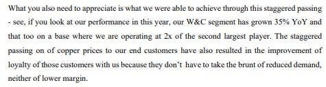 RR Kabel was in a similar position. Just last quarter, its wire capacity still had headroom at 70% utilization, while its cable lines were running hot at 90-95%. This quarter, the combination of available capacity and surging demand helped in a near-doubling of the EBITDA.