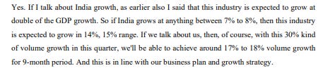 All three improved significantly from Q2, which faces more seasonal demand due to the monsoons. The second half of the year is generally stronger than the first, as many real estate projects kick-off or restart activity in this time.