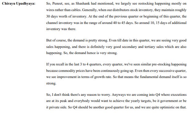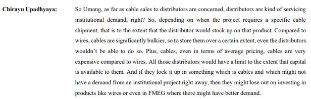 Each company has observed a pre-stocking effect among its distributor network, that too almost wholly in wires rather than cables. Why is that? Well, that’s both due to the product difference in wires and cables, and how they’re sold.