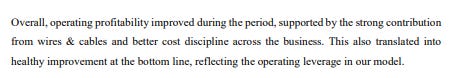 As we’ve covered before, house wires tend to be more profitable than cables. That’s because they’re brand-driven B2C products that are sold through retailers. Cables, though, are often sold institutionally through competitive tenders. So, this shift in sales mix toward wires is partly what helped margins improve.
