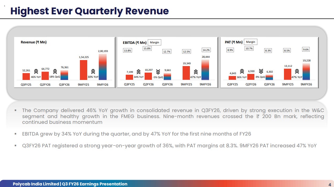 Polycab, the undisputed frontrunner, posted its highest-ever quarterly revenue at ₹7,636 crore — up a massive 46% year-on-year. The absolute net profit grew by 36% year-on-year to ₹630 crore. In a first, for the first nine months of the year, Polycab crossed the ₹200 billion revenue milestone. That EBITDA margin of 12.7% was a touch lower than 13.8% in the same quarter last year — we’ll get to why that is.