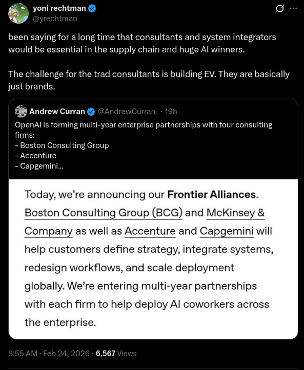 The first could be enterprise AI. An interesting trend unfolding now is that to deploy AI at commercial scale, you might need systems integrators — or services companies that can help with deployment. That, perhaps, is why OpenAI has formed partnerships with Accenture and McKinsey — or why Anthropic signed a deal with Infosys.