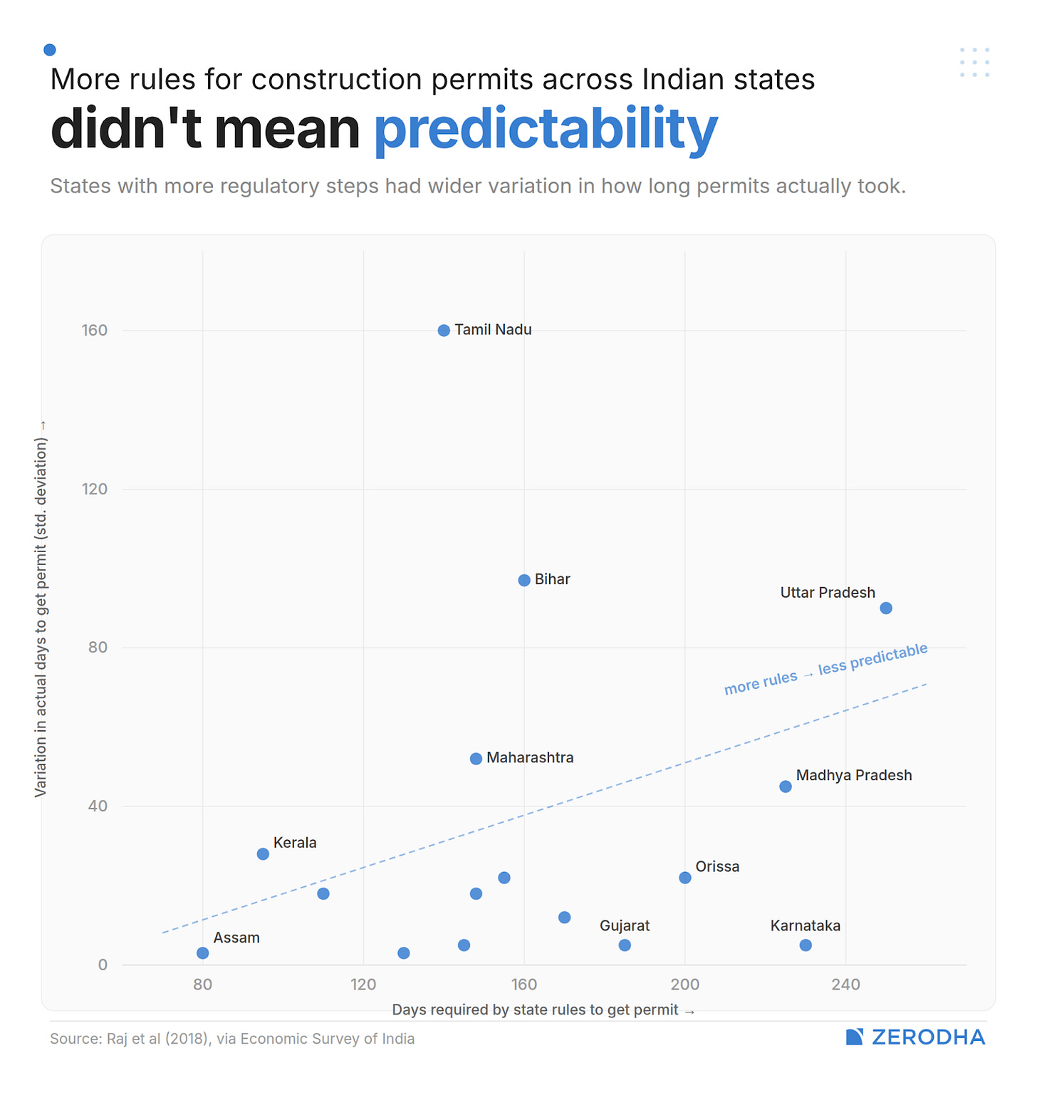 The Economic Survey found exactly this when, for instance, it looked at construction permits across Indian states. States with more elaborate regulatory requirements for granting permits didn’t have more, but rather less predictable timelines. The more boxes an applicant had to tick, the more divergence existed in the experiences of each firm in getting a permit. In many ways, the rules made it feel like a lottery.