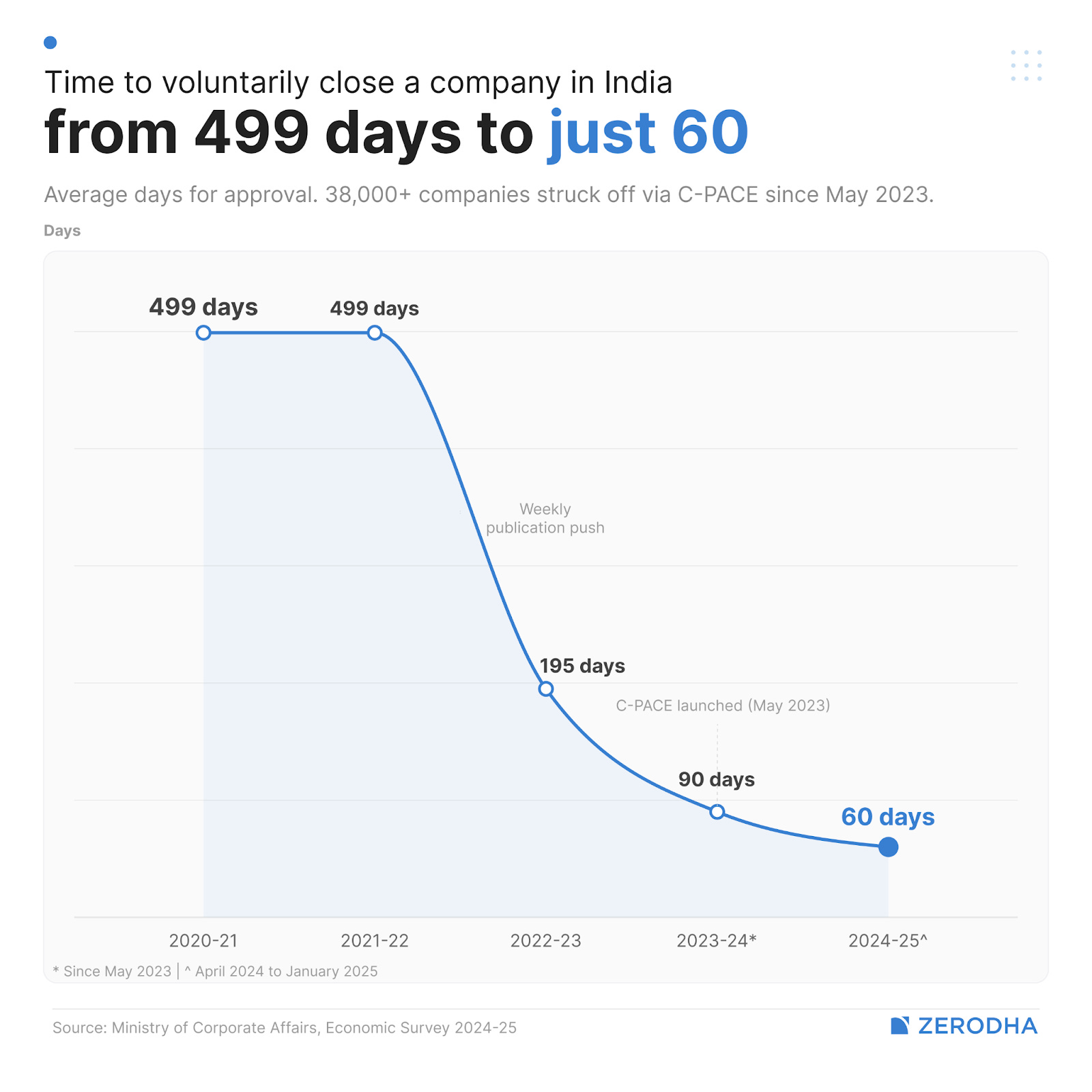 Then, in 2023, the Ministry of Corporate Affairs set up C-PACE — a centralised, faceless, one-window portal. That set fixed timelines for every step with nodal officers identified in each department and resubmission requests capped at two. As a result, average processing time dropped to 60 days by 2024-25. Over 38,000 companies have been struck off through C-PACE since May 2023.