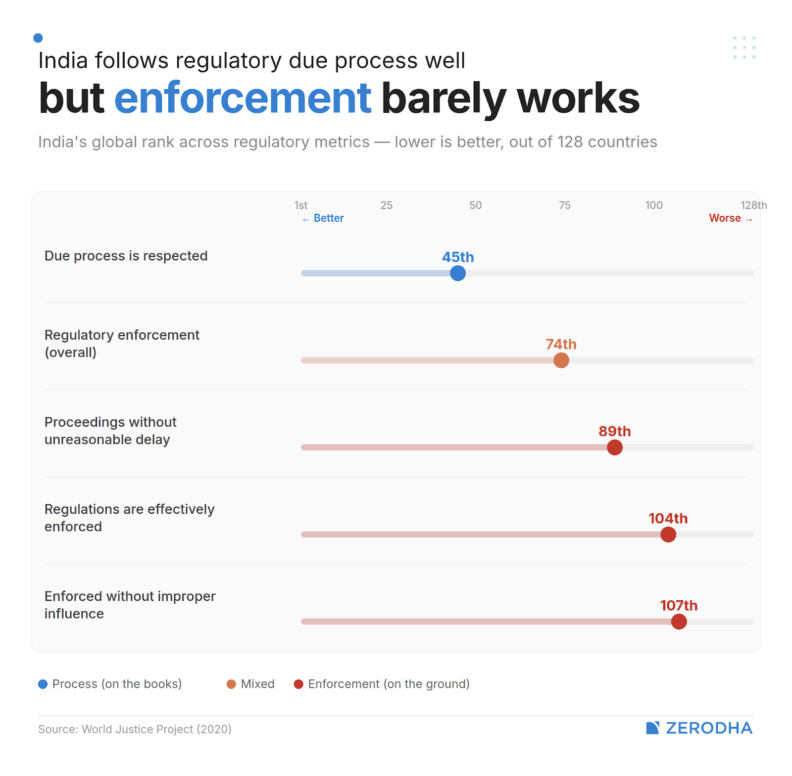 The Economic Survey 2020-21 explains why there are so many broken processes to fix. Cross-country comparisons show that India actually does well at having rules and regulatory standards, and following due process. Where India falls behind, dramatically, is in whether those regulations actually produce results.